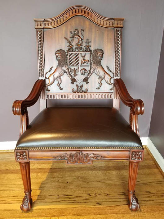 Designer Maitland Smith Hand Carved Crest Wood Chair With Leather